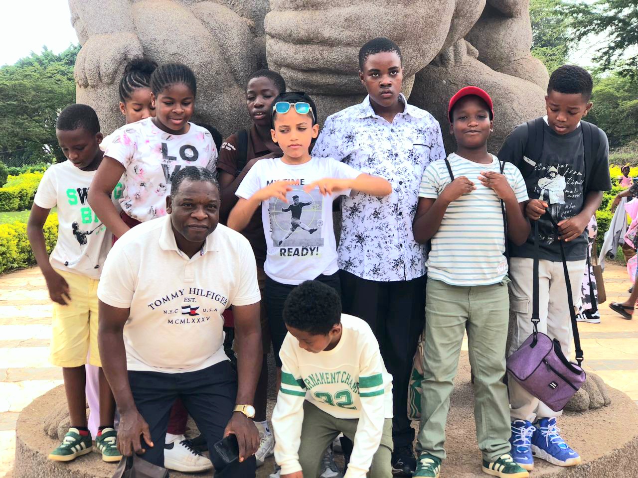 L’attention des enfants s'est particulièrement portée sur la statue monumentale de Gédéon Mpando qui trône à l'entrée. Elle représente un vieillard portant cinq enfants et brandissant le flambeau de la Liberté. Pour ces élèves, l'image est forte : c'est le passage de témoin entre la tradition ancestrale et la modernité.