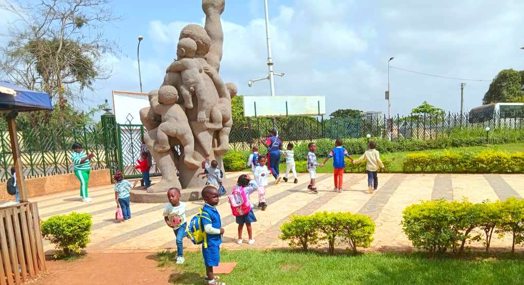 L’attention des enfants s'est particulièrement portée sur la statue monumentale de Gédéon Mpando qui trône à l'entrée. Elle représente un vieillard portant cinq enfants et brandissant le flambeau de la Liberté. Pour ces élèves, l'image est forte : c'est le passage de témoin entre la tradition ancestrale et la modernité.